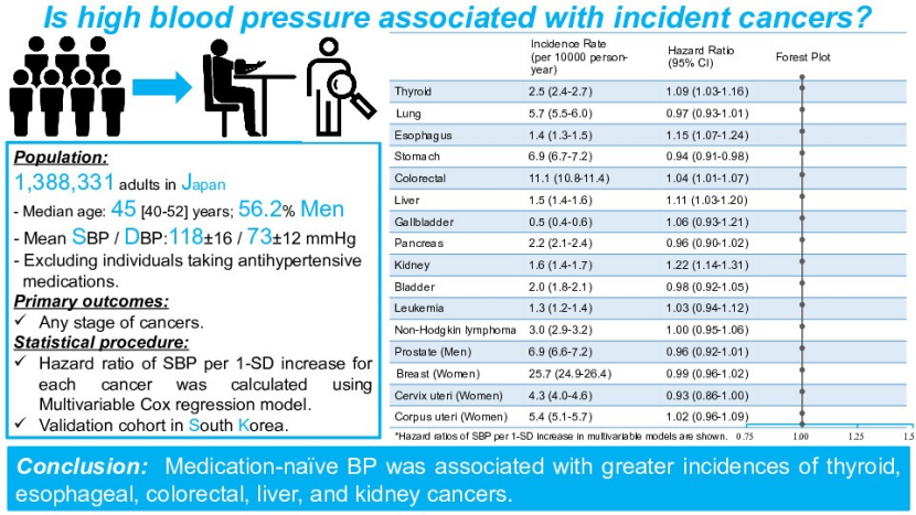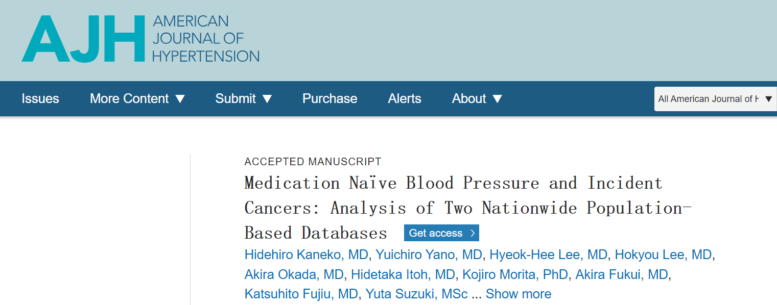 Kaneko H, Yano Y, Lee HH, Lee H, Okada A, Itoh H, Morita K, Fukui A, Fujiu K, Suzuki Y, Matsuoka S, Nakamura S, Michihata N, Jo T, Takeda N, Morita H, Yokoo T, Nishiyama A, Node K, Viera AJ, Muntner P, Oparil S, Kim HC, Yasunaga H, Komuro I. Medication Naïve Blood Pressure and Incident Cancers: Analysis of Two Nationwide Population-Based Databases. Am J Hypertens. 2022 May 4:hpac054. doi: 10.1093/ajh/hpac054. Epub ahead of print. PMID: 35512273.