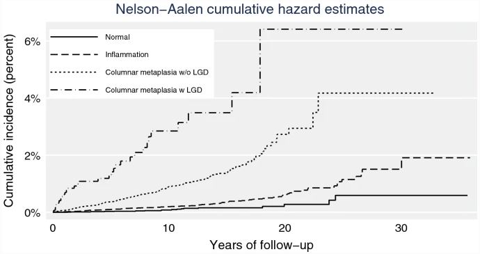 在831,394人·年的隨訪中,共確診了367例食管腺癌(EAC)。食管活檢正常形態(tài)、炎癥改變和化生改變的個體EAC的發(fā)病率(IR)分別為0.1/1000人·年(正常形態(tài))、0.2-0.5/1000人·年和0.8-2.9/1000人·年。