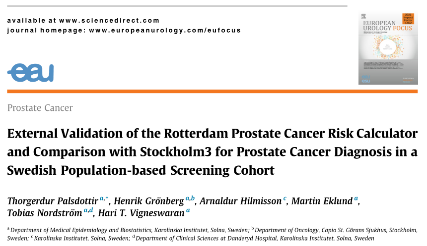 Thorgerdur Palsdottir, Henrik Grönberg, Arnaldur Hilmisson et al. External Validation of the Rotterdam Prostate Cancer Risk Calculator and Comparison with Stockholm3 for Prostate Cancer Diagnosis in a Swedish Population-based Screening Cohort. Eur Urol Focus. Dec 2022.