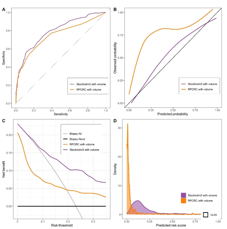研究人員采用了前瞻性、基于人群的隨機STHLM3-MRI篩查試驗的數(shù)據(jù),將前列腺特異性抗原(PSA)≥3 ng/ml或Stockholm3風險閾值≥11%的參與者納入標準組,并進行系統(tǒng)性前列腺活檢。使用RPCRC和Stockholm3計算了每個參與者的臨床顯著性前列腺癌(csPC,國際泌尿外科病理學會等級≥2級)的概率。通過鑒別能力、校準和臨床效益,評估了風險計算工具的性能。