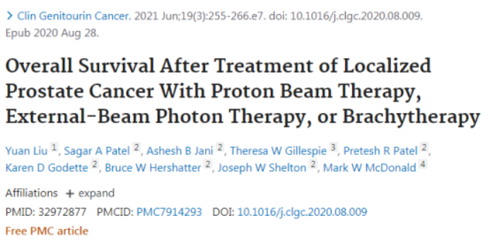 2021年發(fā)表在醫(yī)學(xué)期刊《Clinical Genitourinary Cancer(臨床泌尿生殖系統(tǒng)癌癥)》上的研究分析了美國(guó)國(guó)家癌癥數(shù)據(jù)庫(kù)(NCDB)的數(shù)據(jù),指出,質(zhì)子治療前列腺癌相比傳統(tǒng)光子放療及近距離放療的效果更好,具體數(shù)據(jù)為:質(zhì)子治療前列腺癌的10年生存率為85.6%;傳統(tǒng)光子放療為60.1%;近距離放療為74%[3]。