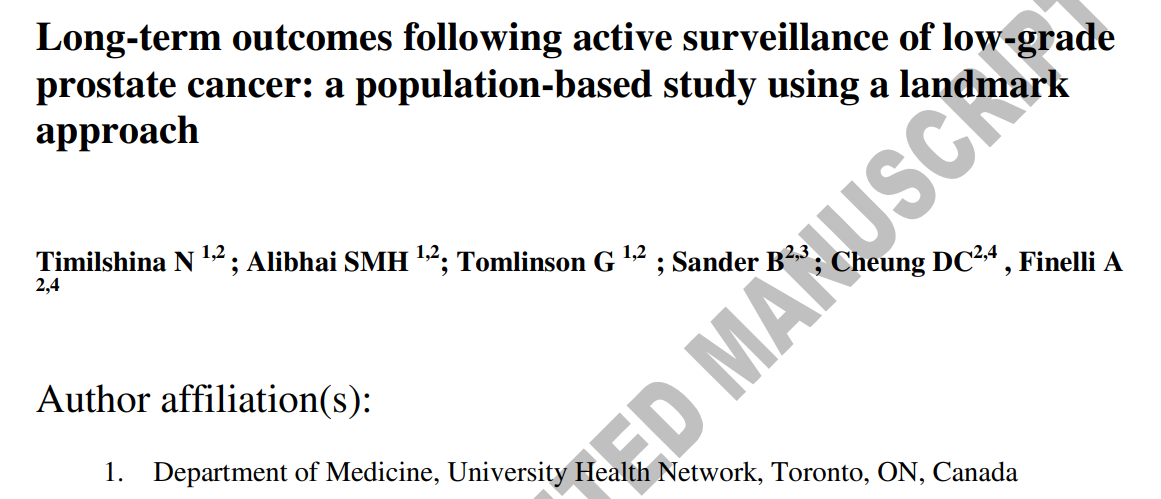 N Timilshina, S M H Alibhai, G Tomlinson et al. Long-Term Outcomes following Active Surveillance of Low-Grade Prostate Cancer: A Population-Based Study Using a Landmark Approach. J Urol. Dec 2022