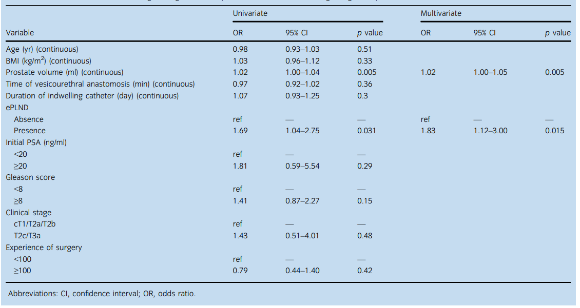 RARP術(shù)后1個月時,尿失禁的單變量和多變量邏輯回歸分析
