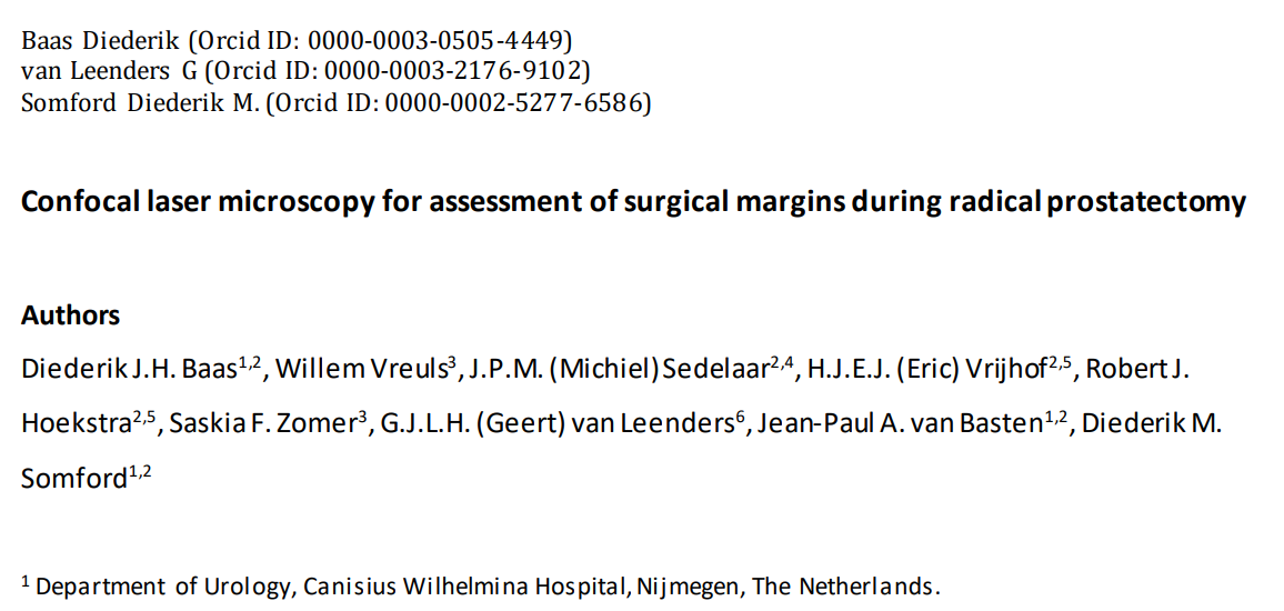 Diederik J H Baas, Willem Vreuls, J P M Michiel Sedelaar et al. Confocal laser microscopy for assessment of surgical margins during radical prostatectomy. BJU Int. Nov 2022.