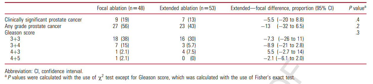 共有51名和55名患者分別接受了局灶和擴(kuò)展不可逆電穿孔消融術(shù)。隨訪時間的中位數(shù)為30個月。3個月時,兩組的勃起功能障礙率和不良事件發(fā)生率相似。局灶消融組在3個月時的國際勃起功能指數(shù)得分更好;在不同時間內(nèi),其擴(kuò)展前列腺癌指數(shù)-性功能得分也比擴(kuò)展消融組好,接近統(tǒng)計學(xué)顯著意義(平均差異1.4;95%CI -0.13至2.9,P=0.073)。兩組之間在其他生活質(zhì)量指標(biāo)上沒有明顯差異。6個月后進(jìn)行前列腺活檢時,局灶組和擴(kuò)展組的臨床意義上的前列腺癌殘留率(Gleason≥3+4)分別為18.8%和13.2%,沒有明顯差異。