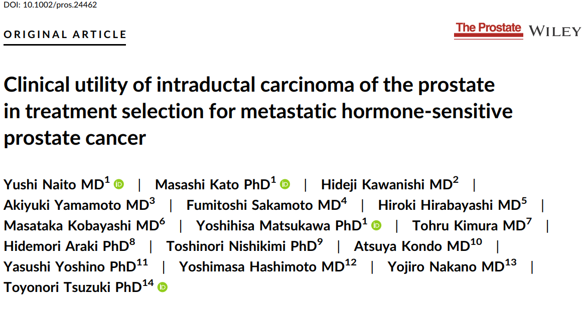 Yushi Naito, Masashi Kato, Hideji Kawanishi et al. Clinical utility of intraductal carcinoma of the prostate in treatment selection for metastatic hormone-sensitive prostate cancer. Prostate. Nov 2022