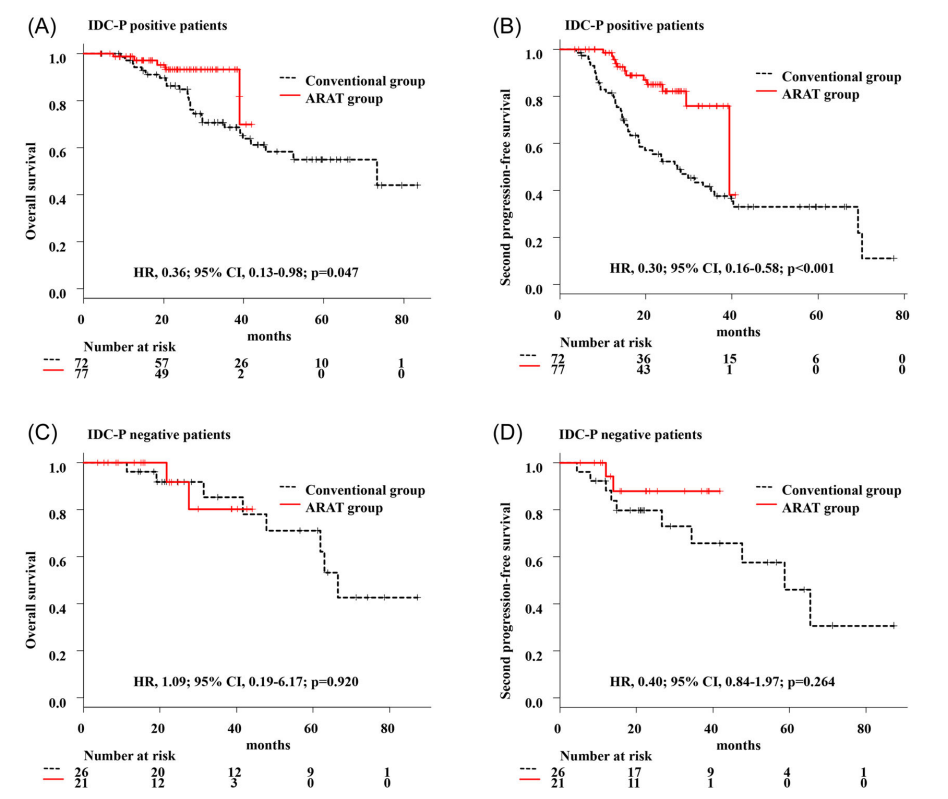 研究結(jié)果發(fā)現(xiàn),ARAT組(79%)和傳統(tǒng)療法組(71%)的大多數(shù)患者為ICD-P陽(yáng)性。在傾向性評(píng)分匹配的隊(duì)列中,ARAT組IDC-P陽(yáng)性患者的OS和PFS2明顯長(zhǎng)于常規(guī)組(OS:危險(xiǎn)比[HR],0.36;p=0.047;PFS2:HR,0.30;p<0.001)。然而,在IDC-P陰性患者中,ARAT組和常規(guī)組在OS和PFS2方面沒(méi)有顯著差異(OS:HR,1.09;p=0.920;PFS2:HR,0.40;p=0.264)。