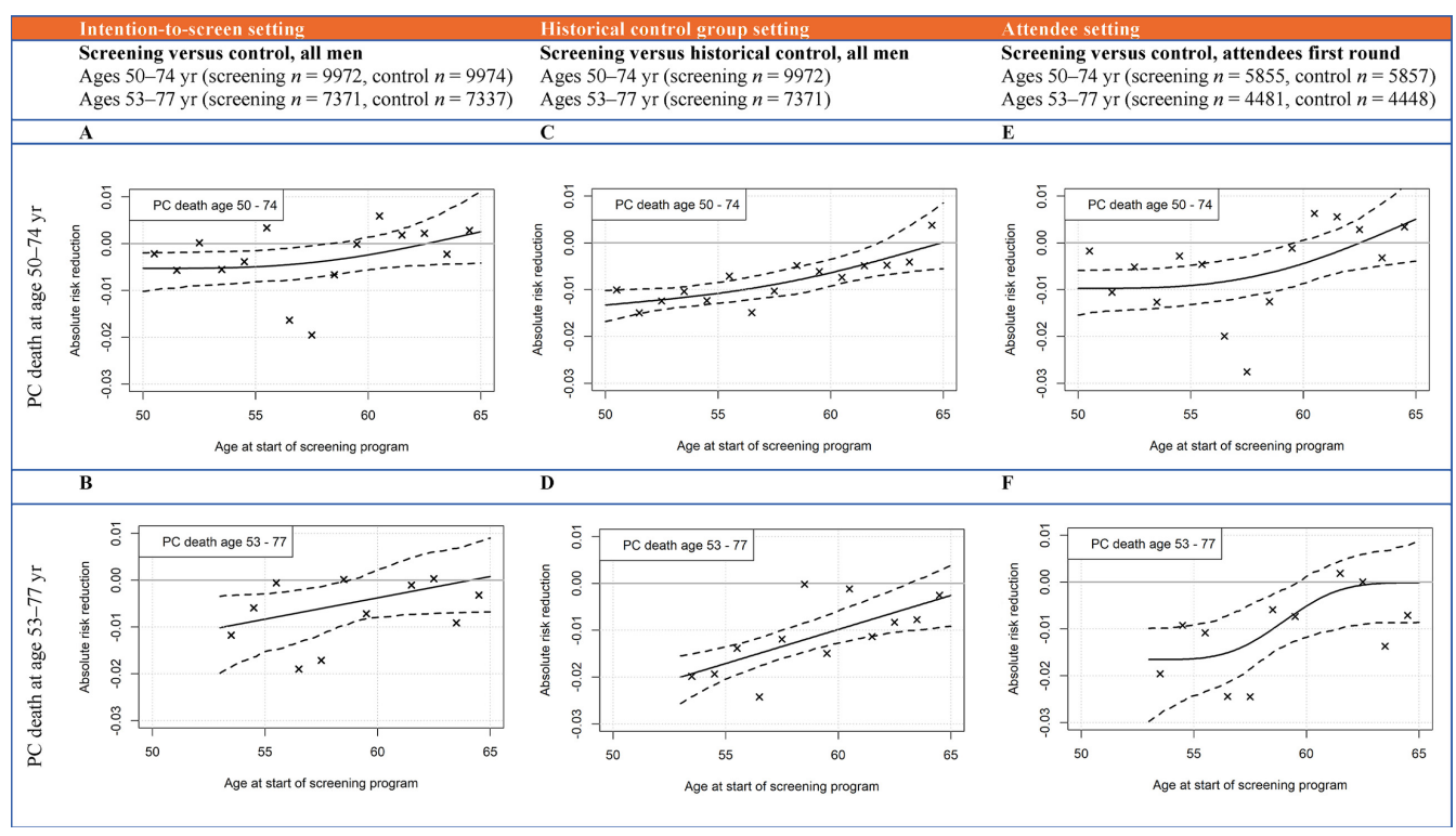 研究招募了50-70歲的男性,并進(jìn)行兩年一次的PSA篩查(n=10000),對(duì)照組不進(jìn)行上述篩查,但有機(jī)會(huì)接受PSA檢測(cè)(n=10000)。即研究的干預(yù)措施是定期或機(jī)會(huì)性PSA篩查或無(wú)PSA篩查。研究人員在三種情況下建立了篩查的起始年齡與PC死亡率絕對(duì)風(fēng)險(xiǎn)降低之間的非線(xiàn)性關(guān)系模型:
