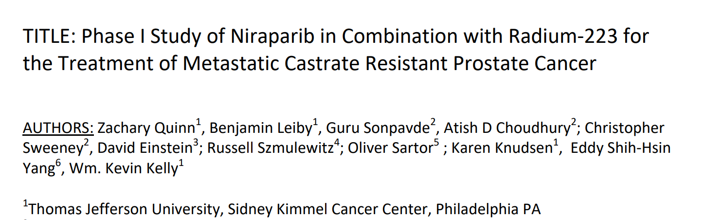 Zachary Quinn, Benjamin Leiby, Guru Sonpavde et al. Phase I Study of Niraparib in Combination with Radium-223 for the Treatment of Metastatic Castrate Resistant Prostate Cancer. Clin Cancer Res. Nov 2022