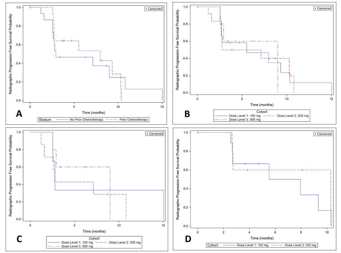 研究納入了接受≥1線雄激素受體(AR)靶向治療后,出現(xiàn)進(jìn)展性mCPRC和骨轉(zhuǎn)移,但沒有已知的BRCA-1或BRCA-2變異或較大內(nèi)臟疾病的男性。Niraparib劑量逐漸升級并與Radium-223標(biāo)準(zhǔn)劑量聯(lián)合使用,并采用時間-事件連續(xù)重新評估的方法進(jìn)行評估。劑量限值毒性(DLT)概率<20%的最高劑量水平定義為最大耐受劑量(MTD)。次要終點(diǎn)包括PSA變化和無進(jìn)展生存。探索性分析包括評估ctDNA中發(fā)現(xiàn)的DNA突變以及全血樣本中評估的基因表達(dá)變化。