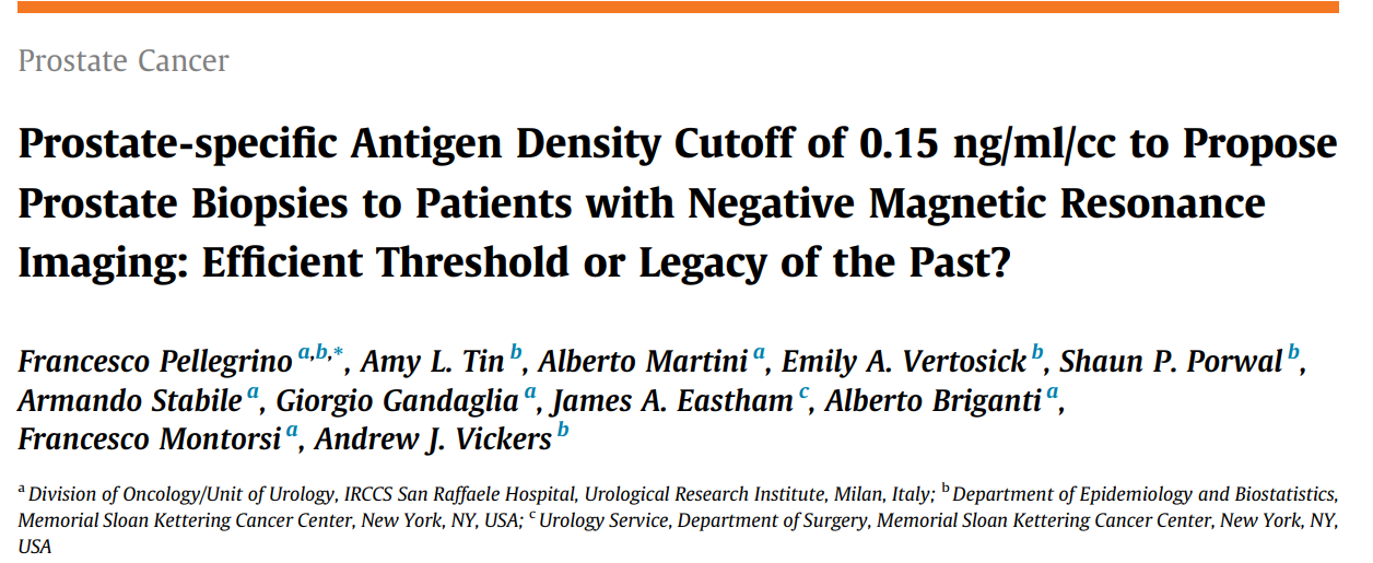 Francesco Pellegrino, Amy L Tin, Alberto Martini et al. Prostate-specific Antigen Density Cutoff of 0.15 ng/ml/cc to Propose Prostate Biopsies to Patients with Negative Magnetic Resonance Imaging: Efficient Threshold or Legacy of the Past? Eur Urol Focus. Oct 2022