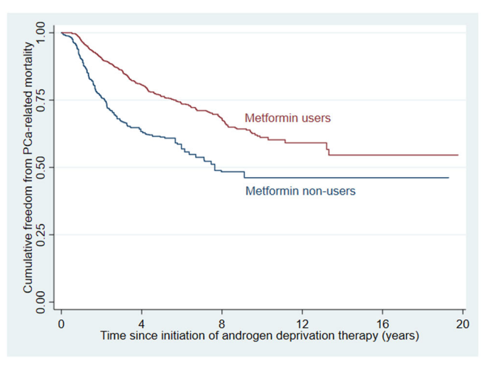 研究的分析隊(duì)列包括了1971名患者(1284名二甲雙胍使用者和687名非使用者;平均年齡76.2±7.8歲)。在平均4.1±3.2年的隨訪中,二甲雙胍使用者的PCa相關(guān)死亡風(fēng)險(xiǎn)(加權(quán)危險(xiǎn)比[wHR]。0.49[95%置信區(qū)間,CI:0.39-0.61],p<0.001)和全因死亡率(wHR 0.53[0.46-0.61],p<0.001)顯著降低,且與糖尿病控制或慢性腎臟疾病狀態(tài)無關(guān)。在沒有使用雄激素受體拮抗劑或化療的情況下,這種影響在不太晚期的PCa患者中似乎更強(qiáng)(交互作用P值:0.017,PCa相關(guān)死亡率;0.048,全因死亡率)。