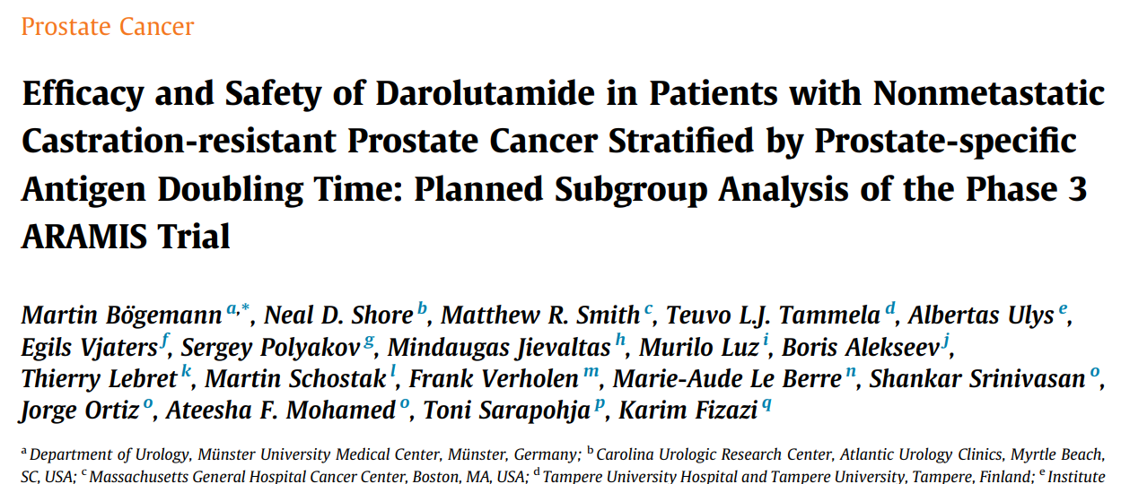 Martin Bögemann, Neal D Shore, Matthew R Smith et al. Efficacy and Safety of Darolutamide in Patients with Nonmetastatic Castration-resistant Prostate Cancer Stratified by Prostate-specific Antigen Doubling Time: Planned Subgroup Analysis of the Phase 3 ARAMIS Trial. Eur Urol. Sep 2022.