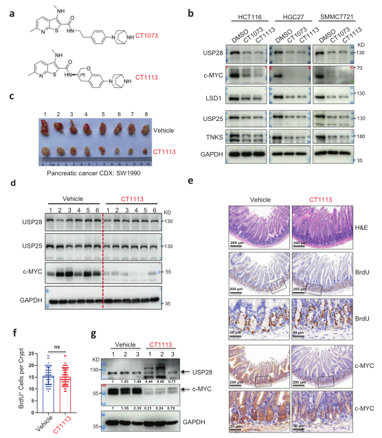 C-myc免疫組織化學(xué)染色顯示對(duì)照組有很強(qiáng)的c-myc表達(dá),而CT1113處理的腸段c-myc表達(dá)明顯減少,這與免疫印跡分析的結(jié)果一致。然而,c-myc的表達(dá)在隱窩中持續(xù)存在,這表明盡管受到USP28的抑制,干細(xì)胞仍能保持c-myc的表達(dá)。