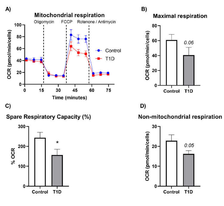 與對(duì)照組相比,T1D患者血液中的快速抗氧化劑和總抗氧化劑水平較低,而他們的白細(xì)胞產(chǎn)生較高數(shù)量的總活性氧物種(ROS)和超氧陰離子自由基。與對(duì)照組相比,T1D組和對(duì)照組PBMCs的基礎(chǔ)呼吸和與ATP相關(guān)的呼吸相似,但T1D組PBMCs的備用呼吸量減少,最大呼吸減少,非線(xiàn)粒體呼吸減少。