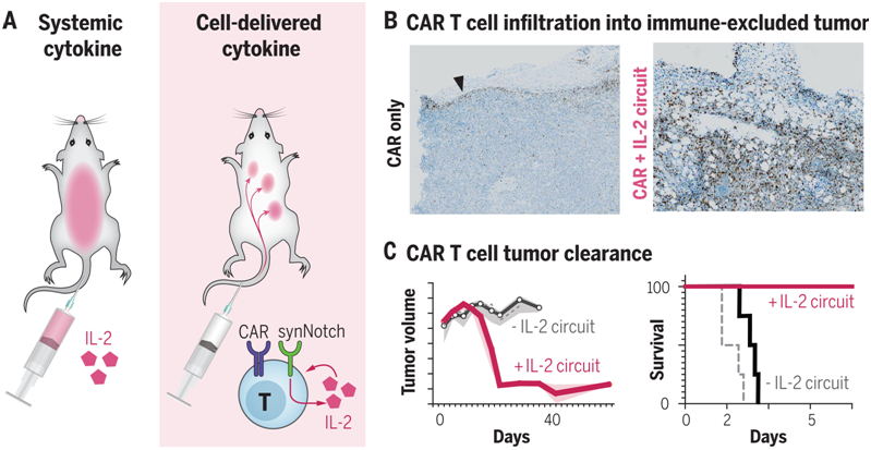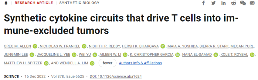Greg M. Allen et al. Synthetic cytokine circuits that drive T cells into immune-excluded tumors. Science, 2022, doi:10.1126/science.aba1624.