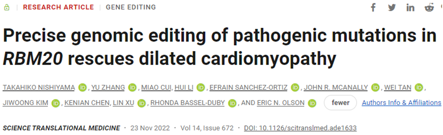 1. Takahiko Nishiyama et al. Precise genomic editing of pathogenic mutations in RBM20 rescues dilated cardiomyopathy. Science Translational Medicine, 2022, doi:10.1126/scitranslmed.ade1633.