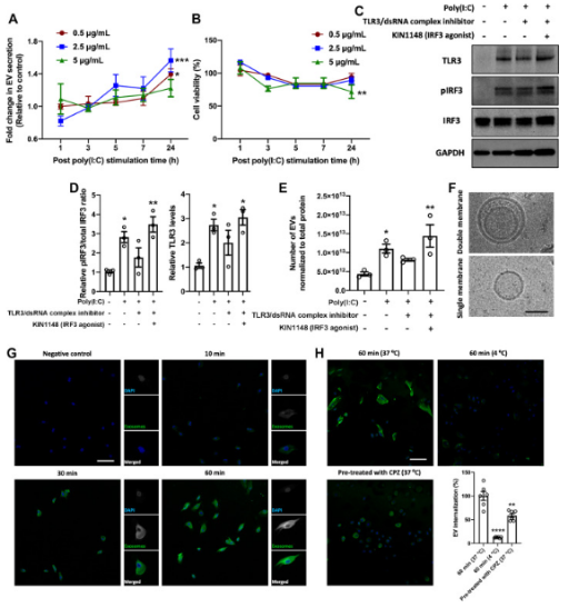 之后評估TLR3刺激的EV介導(dǎo)的體外抗病毒活性,發(fā)現(xiàn)TLR3刺激可能會改變EV中的因子物質(zhì)并賦予EV增強(qiáng)的抗病毒特性。