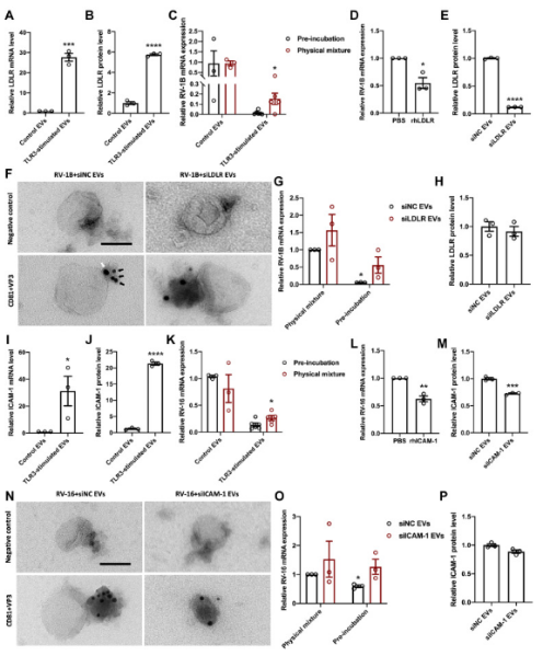 為了探索LDLR和ICAM-1在EV中抑制病毒感染的作用,在TLR3刺激的EV中沉默LDLR或ICAM-1 mRNA表達(dá),發(fā)現(xiàn)LDLR或ICAM-1沉默回削弱對應(yīng)的病毒與TLR3刺激的EV之間的相互作用,從而促進(jìn)病毒進(jìn)入宿主細(xì)胞。