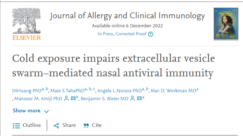 [1] Di Huang, Maie S. Taha, Angela L. Nocera, Alan D. Workman, Mansoor M. Amiji, Benjamin S. Bleier,Cold exposure impairs extracellular vesicle swarm–mediated nasal antiviral immunity,
