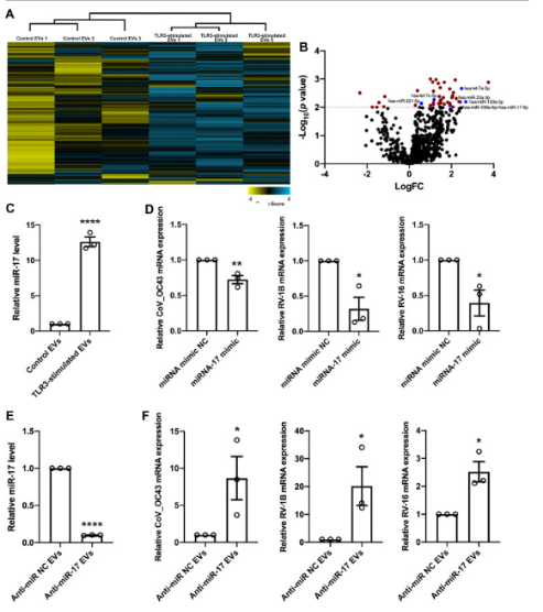 明確TLR3刺激的EV有抗病毒活性后,研究者進(jìn)一步探索了潛在的抗病毒機(jī)制,通過層次聚類分析、火山圖數(shù)據(jù)分析,最終發(fā)現(xiàn)6個在TLR3刺激后顯著上調(diào)并與抗病毒作用相關(guān)的miRNA,其中將已被報道在上呼吸感染期間抑制病毒復(fù)制的miR-17作為待驗證的作用機(jī)制目標(biāo)。