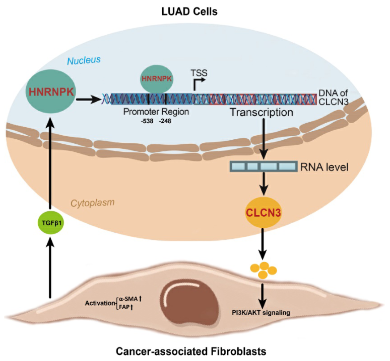 體外和體內(nèi)實(shí)驗(yàn)結(jié)果表明,CLCN3的表達(dá)和功能受HNRNPK的調(diào)控。通過(guò)從人LUAD中分離原代腫瘤相關(guān)成纖維細(xì)胞(CAF),研究者證實(shí)了HNRNPK基因敲除引起的細(xì)胞外CLCN3分泌減少抑制了CAF的激活和轉(zhuǎn)化生長(zhǎng)因子-β1的產(chǎn)生,從而反饋地抑制了核HNRNPK的表達(dá)和LUAD的進(jìn)展。