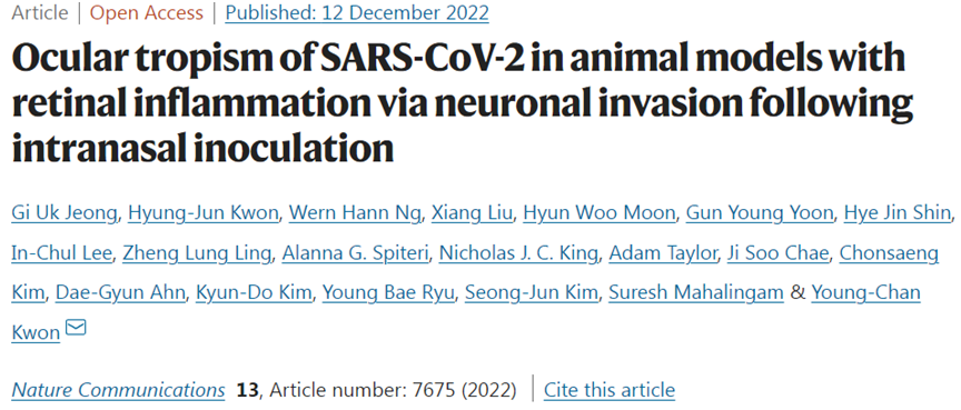 Gi Uk Jeong et al. Ocular tropism of SARS-CoV-2 in animal models with retinal inflammation via neuronal invasion following intranasal inoculation. Nature Communications, 2022, doi:10.1038/s41467-022-35225-1.