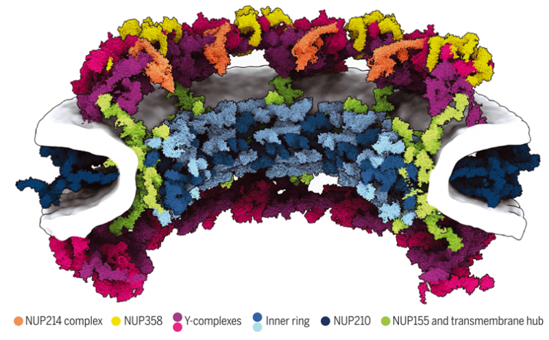 真核生物的細胞核保護著基因組,被核包膜的兩層膜所包圍。核孔復(fù)合體(Nuclear pore complex, NPC)穿過核包膜以促進核質(zhì)運輸。人類NPC的分子量為120兆道爾頓(MDa),是最大的蛋白復(fù)合體之一。它共有約1000個蛋白,由一組約30個不同的核孔蛋白(nucleoporin, NUP)組成,每個NUP存在許多個拷貝。它們可以粗略地分為兩類:支架型NUP和天然無序NUP。支架型NUP含有折疊的結(jié)構(gòu)域,并在一個中心通道周圍形成一個圓柱形的支架結(jié)構(gòu)。天然無序NUP排列在這種支架結(jié)構(gòu)上并延伸到這個中央通道,在那里它們與貨物復(fù)合物相互作用。NPC的結(jié)構(gòu)是高度動態(tài)的。它通過構(gòu)象呼吸(conformational breathing)對核包膜張力的變化做出反應(yīng),表現(xiàn)為擴張和收縮運動。闡明原子分辨率下的支架結(jié)構(gòu)對于更精確地了解NPC的功能和動態(tài)非常重要,但這對結(jié)構(gòu)生物學家來說是一個巨大的挑戰(zhàn)。