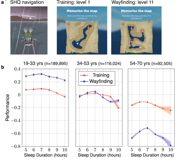 除了完成測試導(dǎo)航能力的任務(wù)外,任何玩該游戲的參與者都被要求回答有關(guān)人口特征的問題,以及其它對于神經(jīng)科學(xué)研究有用的問題,比如睡眠模式等。研究人員發(fā)現(xiàn),在整個研究樣本中,人們平均每晚的睡眠時間為7.01個小時,女性相比男性要多睡7.5分鐘時間。研究者發(fā)現(xiàn),樣本中最年輕的參與者(最小年齡為19歲)睡眠時間最長,而且睡眠持續(xù)時間在參與者20多歲和30歲時一直在下降,直到其50多歲時才趨于平穩(wěn)并再次增加;這種模式包括新識別出的33歲睡眠下降趨于平穩(wěn)和53歲時睡眠時間再次增加的關(guān)鍵時間點,而對于男性和女性而言以及對于不同國家和教育水平的參與者而言,這種模式都是一樣的,研究者表示,中年時期睡眠時間的下降或許是由于育兒和工作生活的需求所造成的。