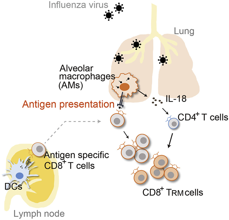在這項新的研究中,這些作者揭示當(dāng)抗原特異性的殺傷性T細胞(CD8+T細胞)遇到呈遞抗原的肺泡巨噬細胞(alveolar macrophage)時,它們在肺部迅速擴增,以保護肺部免受病毒感染。
