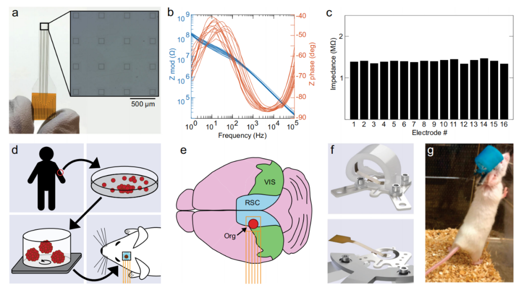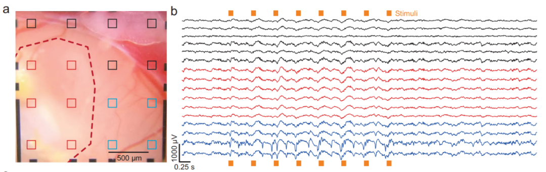 通過在移植的類器官上放置一個這樣的電極陣列,研究團隊能夠記錄來自植入的類器官和周圍宿主皮層的實時神經活動。通過雙光子成像,他們還觀察到小鼠血管生長到類器官植入物中,為其提供必要的營養(yǎng)和氧氣。