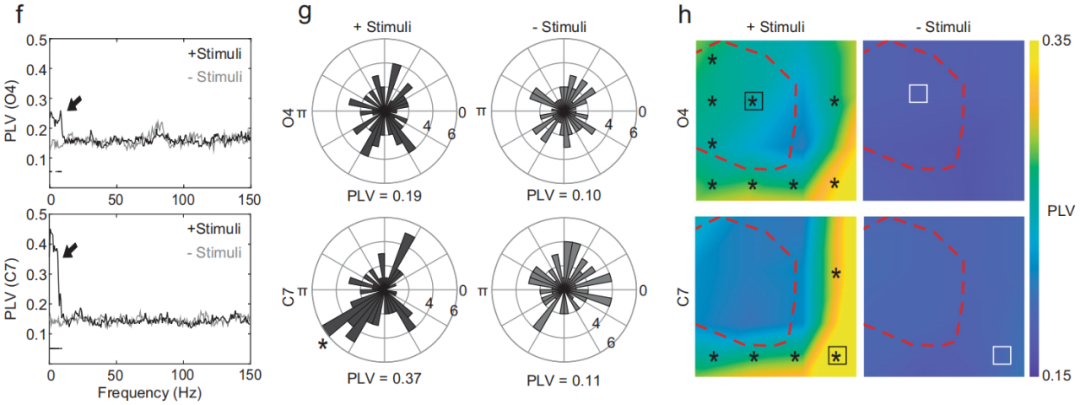 此外,這種透明石墨烯電極技術能夠記錄類器官和周圍小鼠皮層的電尖峰信號,石墨烯記錄顯示伽馬振蕩的功率增加,以及從類器官到小鼠視覺皮層的緩慢振蕩的尖峰相位鎖定。這些發(fā)現(xiàn)表明,類器官在植入三周后就與周圍的皮層組織建立了突觸連接,并接受了來自小鼠大腦的功能輸入。