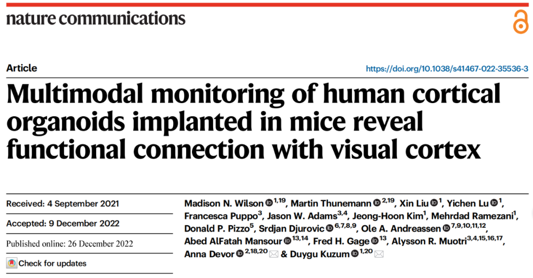 近日,美國加州大學圣地亞哥分校的研究人員在 Nature Communications 期刊發(fā)表了題為:Multimodal monitoring of human cortical organoids implanted in mice reveal functional connection with visual cortex 的研究論文。