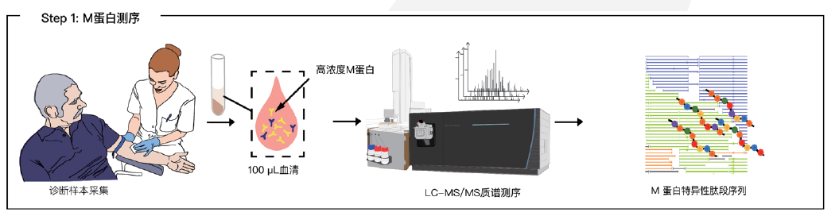 第一階段:采用蛋白質(zhì)質(zhì)譜對(duì)診斷期MM患者血清中的M蛋白進(jìn)行測(cè)序,僅需100微升,便可以在上??煨虻牡鞍诇y(cè)序平臺(tái)上確定M蛋白的氨基酸全長(zhǎng)序列。