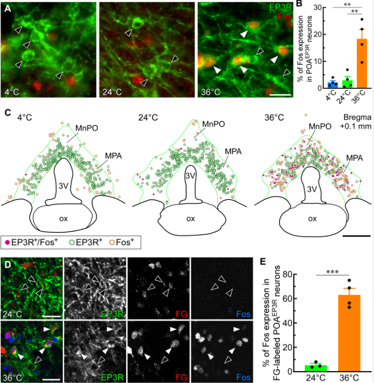 然而,目前研究人員并不清楚視前區(qū)中的那種神經(jīng)元能釋放增加或降低機(jī)體體溫的指令,為了識(shí)別出到底是哪種神經(jīng)元,研究者Kazuhiro Nakamura等人對(duì)大鼠進(jìn)行研究,重點(diǎn)分析了其視前區(qū)中EP3神經(jīng)元,該神經(jīng)元能表達(dá)PGE2的EP3受體,同時(shí)研究人員還調(diào)查了其調(diào)節(jié)機(jī)體體溫的功能。這項(xiàng)研究中,研究人員首次分析了視前區(qū)中EP3神經(jīng)元的活性是如何隨著環(huán)境溫度的改變而發(fā)生變化;大鼠所處的舒適環(huán)境溫度約為28度,在兩個(gè)小時(shí)內(nèi),研究人員將大鼠暴露于寒冷(4度)、室溫(24度)和高溫(36度)環(huán)境中,研究結(jié)果表明,暴露于36度下或能激活EP3神經(jīng)元,而暴露于4度和24度下則并不會(huì)。