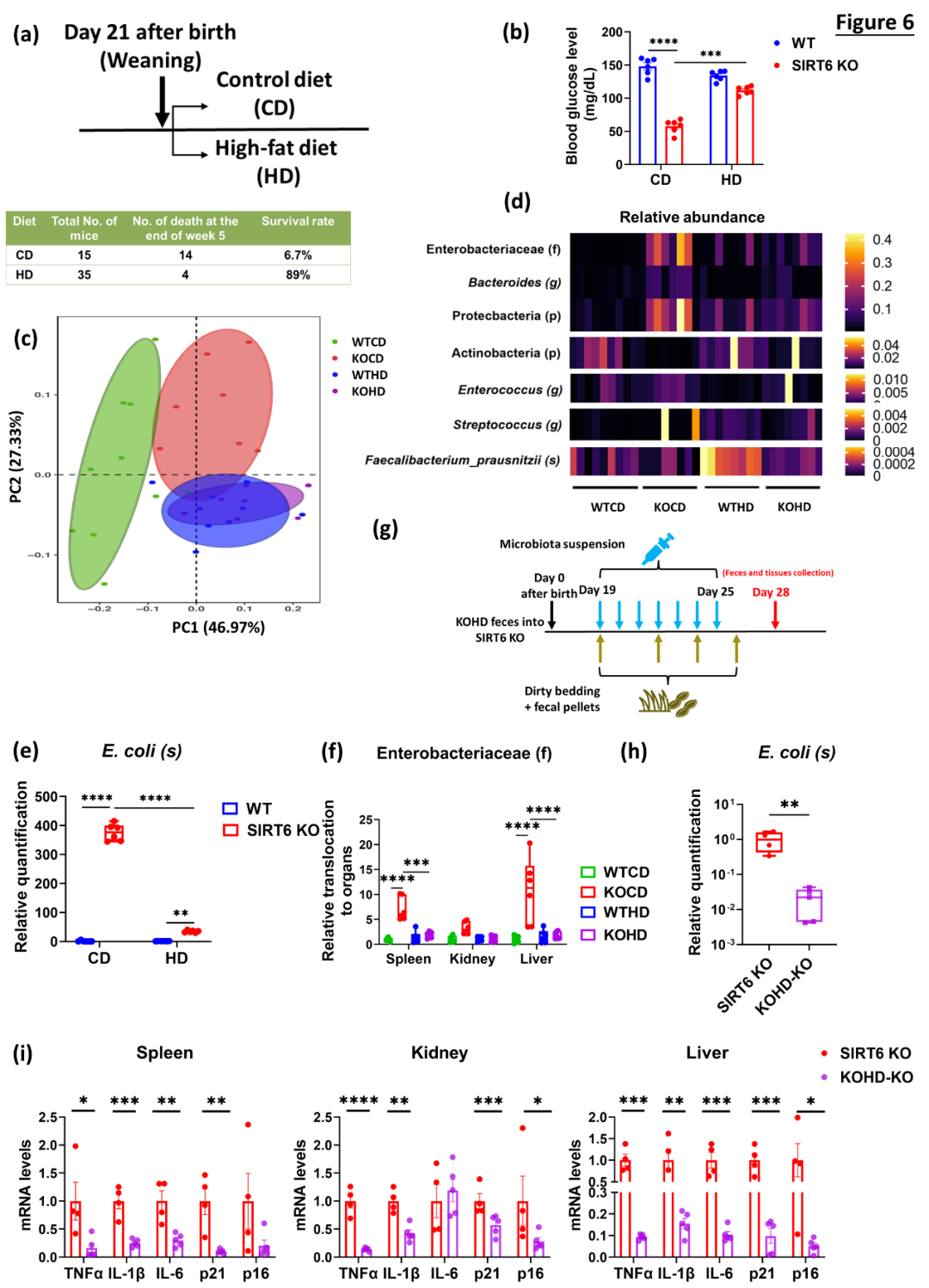 高脂飲食在提高SIRT6 KO小鼠存活率、改善低血糖癥的同時(shí),也重塑其菌群,尤其是顯著減少Escherichia coli水平及內(nèi)臟器官Enterobacteriaceae移位。將飲食干預(yù)后的SIRT6 KO小鼠菌群再次移植給KO小鼠,依舊能夠有效降低KO小鼠組織器官中炎癥因子和衰老標(biāo)志物的表達(dá)水平。
