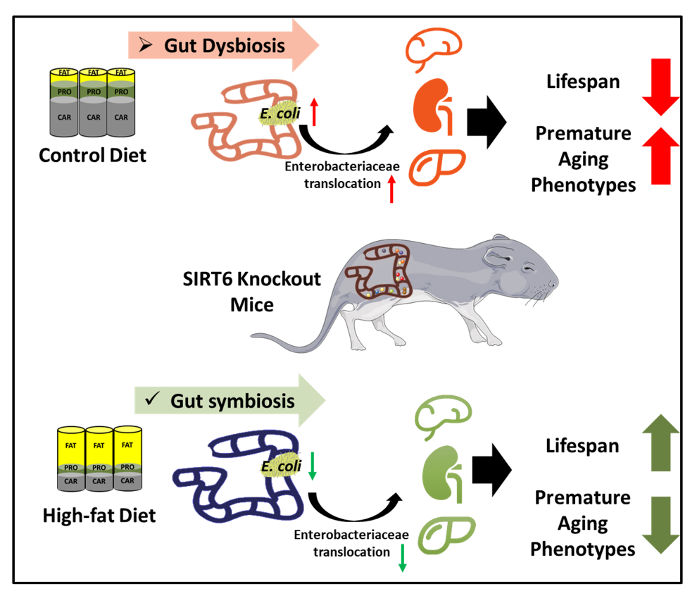 隨著全世界范圍內(nèi)人口老齡化的加劇,衰老和衰老相關(guān)疾病給個(gè)人、家庭和社會帶來嚴(yán)重負(fù)擔(dān),減緩衰老和預(yù)防衰老相關(guān)疾病成為目前科學(xué)研究的熱點(diǎn)問題。此前,王釗課題組已報(bào)道高脂飲食緩解SIRT6敲除小鼠代謝異常和多組織器官萎縮等衰老相關(guān)機(jī)體過度消耗表征,并將小鼠壽命由4周齡延長至26周齡(雄性)或38周齡(雌性)。在此基礎(chǔ)上,這項(xiàng)新研究著眼于腸道菌群,重點(diǎn)探討腸道菌群在高脂飲食改善早衰過程中發(fā)揮的重要功能。