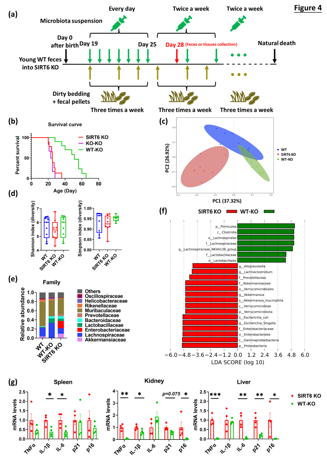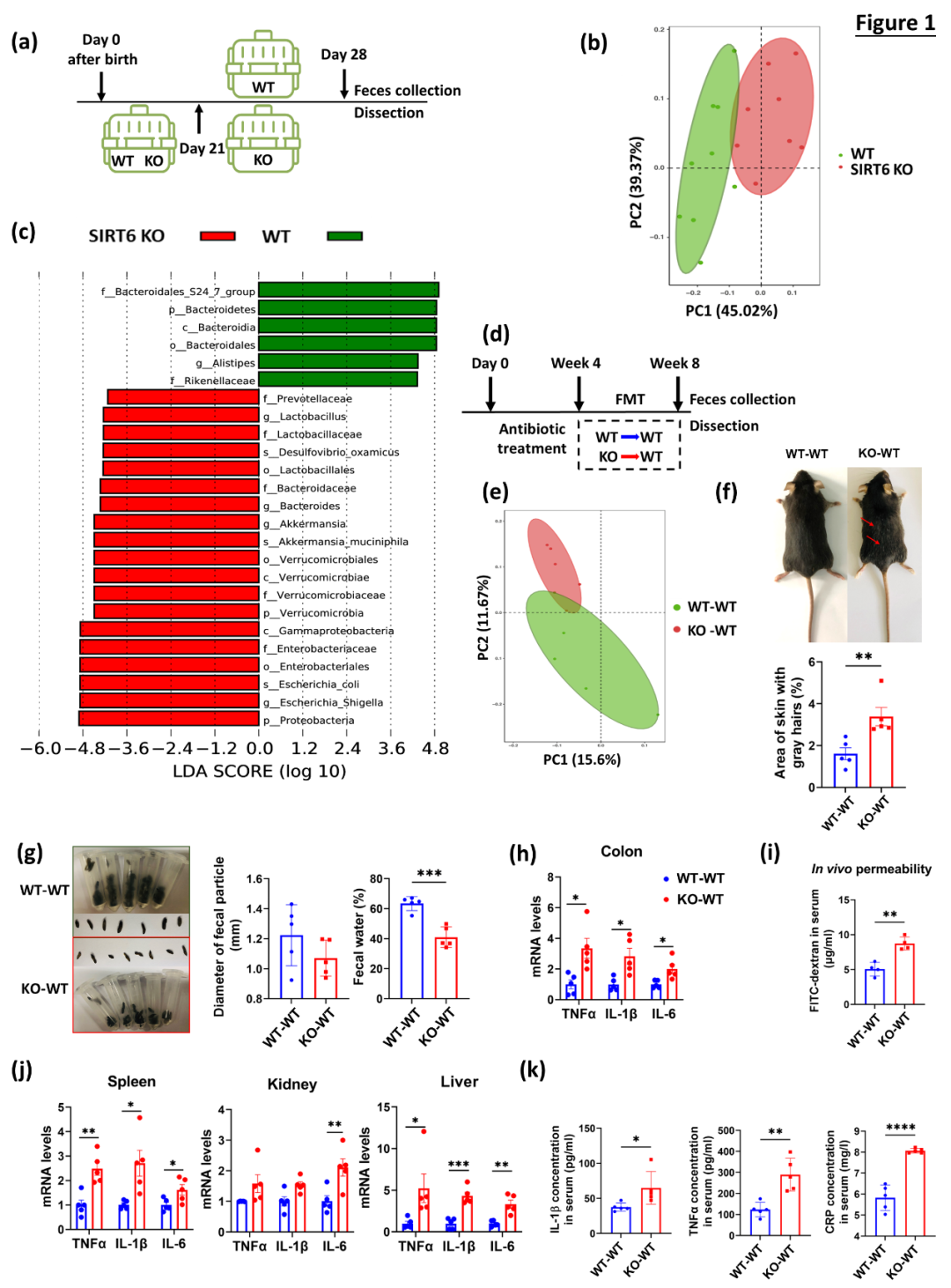 圖一:將SIRT6敲除小鼠腸道菌群移植給年輕野生小鼠后可誘導(dǎo)野生小鼠出現(xiàn)加速早衰相關(guān)表型
