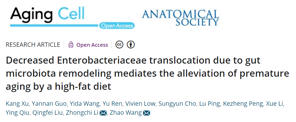 近日,清華大學(xué)藥學(xué)院王釗教授課題組在 Aging Cell 期刊發(fā)表了題為:Decreased Enterobacteriaceae translocation due to gut microbiota remodeling mediates the alleviation of premature aging by a high-fat diet 的研究論文。