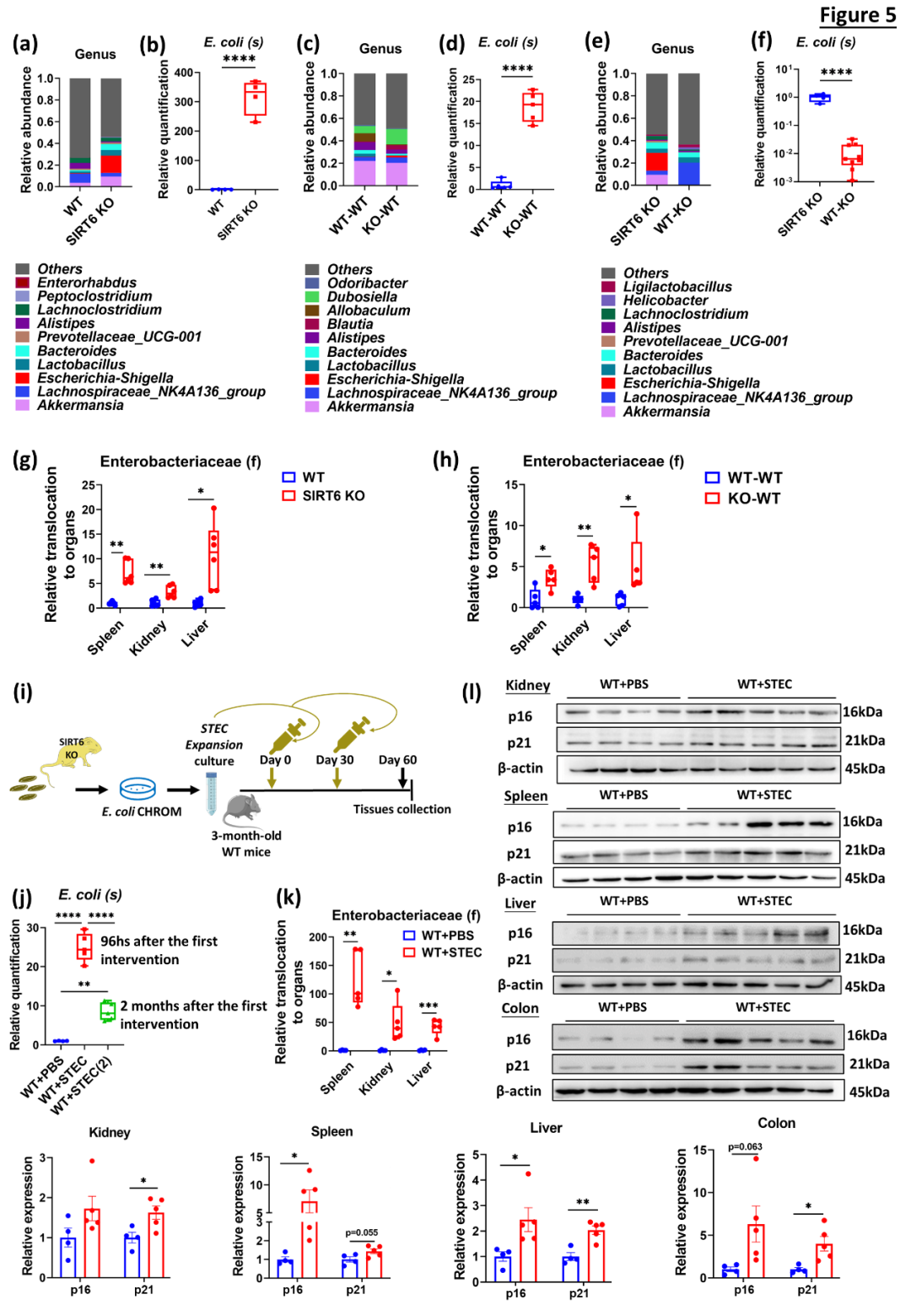 通過比較野生小鼠、SIRT6 KO小鼠、接受SIRT6 KO菌群移植的野生小鼠、接受野生小鼠菌群移植的SIRT6 KO小鼠等不同組小鼠的菌群結(jié)構(gòu),結(jié)果指向Escherichia coli 可能是誘導(dǎo)衰老的關(guān)鍵菌種。已有報(bào)道 Escherichia coli的過度生長將導(dǎo)致腸道內(nèi)細(xì)菌向其他內(nèi)臟器官移位并進(jìn)一步加速組織損傷,本研究發(fā)現(xiàn)小鼠脾臟、肝臟、腎臟中Enterobacteriaceae移位與Escherichia coli豐度變化呈現(xiàn)一致性。分離、培養(yǎng)SIRT6 KO小鼠糞便中的Escherichia coli并灌胃給野生小鼠,該小鼠組織器官中衰老標(biāo)志物的表達(dá)水平顯著升高。
