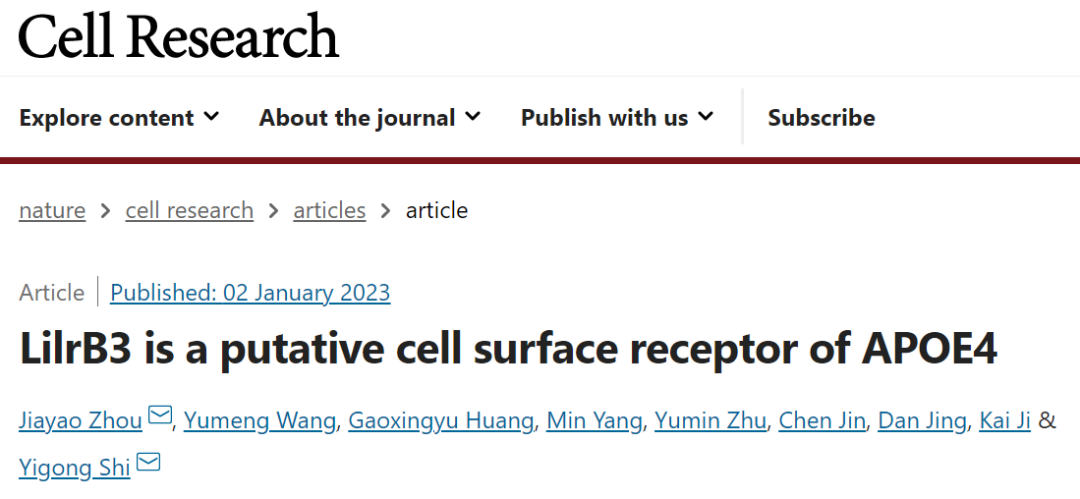 2022年1月2日,西湖大學(xué)施一公團(tuán)隊(duì)在 Cell Research 期刊發(fā)表了題為:LilrB3 is a putative cell surface receptor of APOE4 的研究論文。