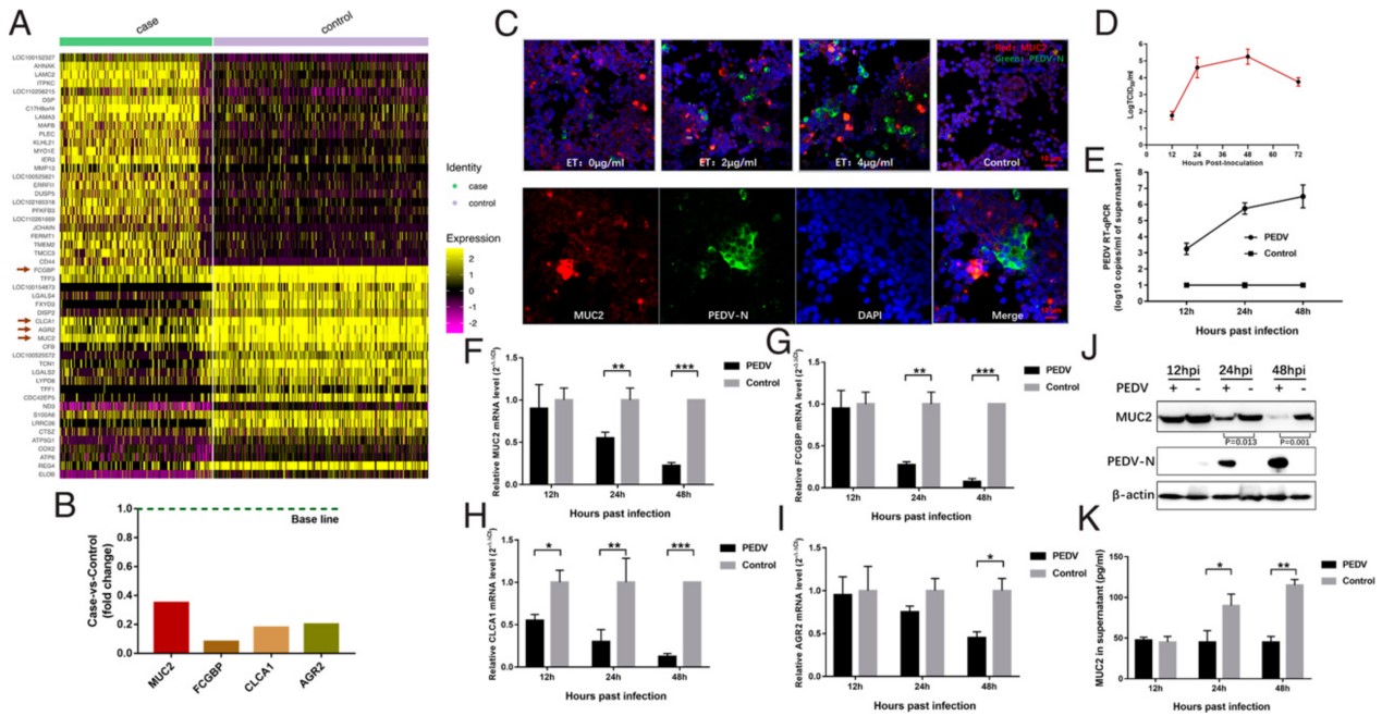 研究人員通過對PEDV感染后杯狀細(xì)胞深入分析發(fā)現(xiàn),PEDV感染會(huì)顯著下調(diào)杯狀細(xì)胞中多種黏蛋白分子的表達(dá)。在體外,采用人結(jié)腸癌杯狀細(xì)胞系作為模型發(fā)現(xiàn),PEDV感染會(huì)顯著降低重要腸道黏蛋白MUC2和其他黏液成分FCGBP、CLCA1和AGR2表達(dá),并對MUC2的外泌具有限制作用。