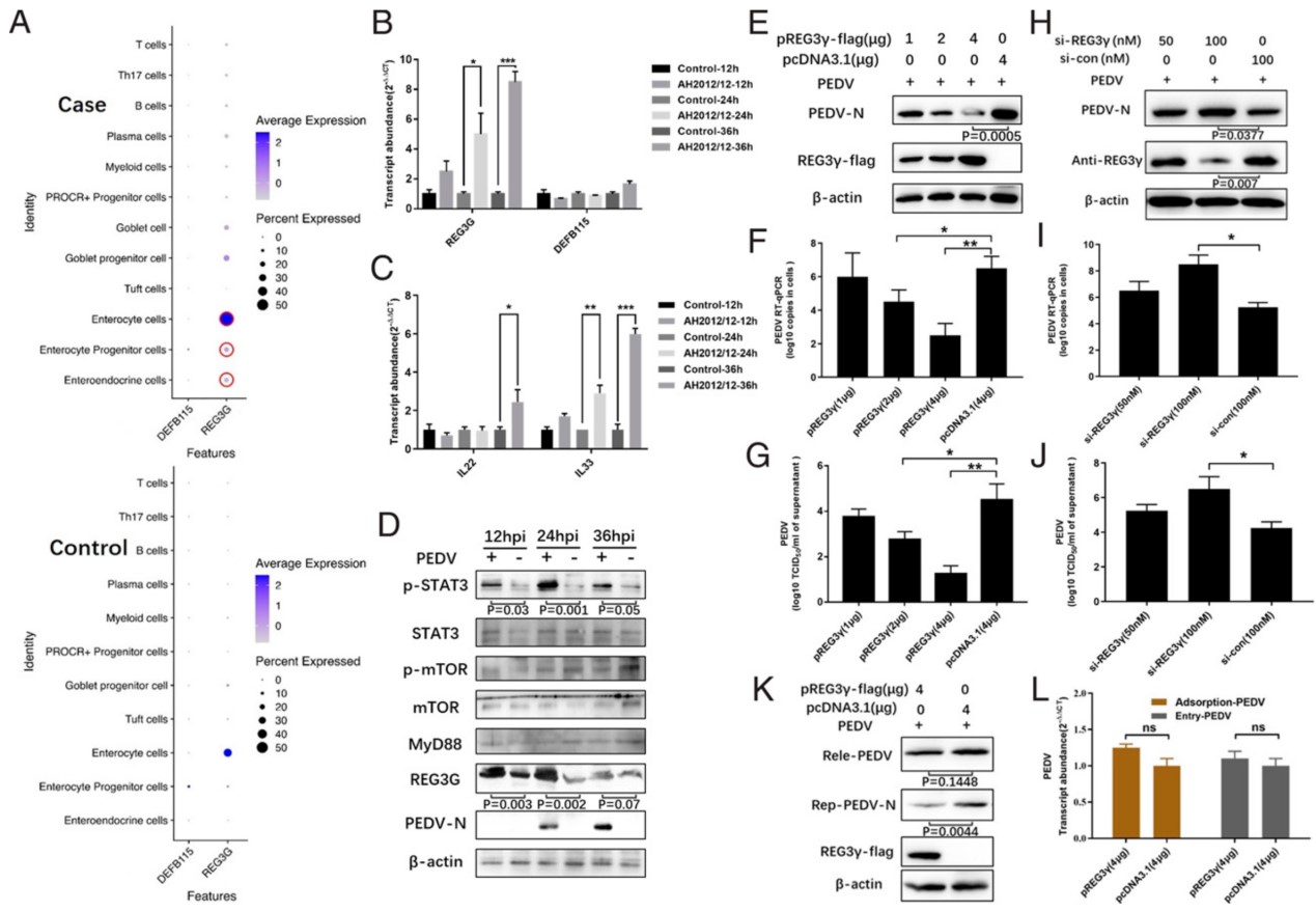 通過對抗菌肽相關(guān)基因的分析發(fā)現(xiàn),PEDV感染顯著上調(diào)腸上皮細(xì)胞中REG3G的表達(dá),而REG3G具有顯著抑制PEDV復(fù)制作用,并作用于病毒復(fù)制周期的胞內(nèi)復(fù)制階段;進(jìn)一步的機(jī)制研究發(fā)現(xiàn),PEDV感染通過上調(diào)IL-33表達(dá),誘導(dǎo)STAT3磷酸化路徑上調(diào)REG3G表達(dá)。