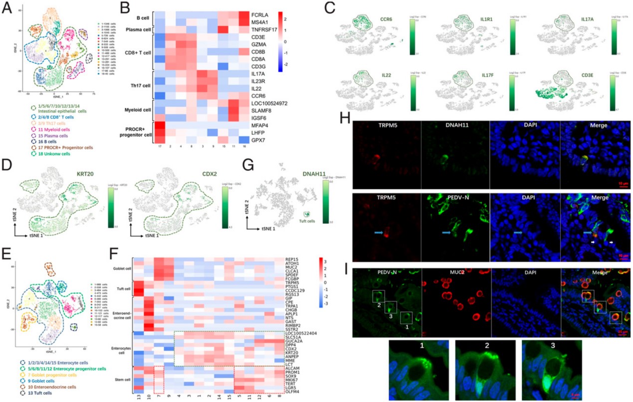 在該項(xiàng)工作中,研究人員對PEDV感染后的仔豬空腸段進(jìn)行了單細(xì)胞測序分析,鑒定了仔豬腸道上皮細(xì)胞、杯狀細(xì)胞、Tuft細(xì)胞、腸分泌細(xì)胞和干細(xì)胞,以及免疫相關(guān)B細(xì)胞、漿細(xì)胞、CD8+ T細(xì)胞、Th17細(xì)胞和髓樣細(xì)胞等不同細(xì)胞類型的代表性標(biāo)記分子;新鑒定DNAH11為仔豬腸道Tuft細(xì)胞的特異性標(biāo)記分子。通過對PEDV感染的腸道細(xì)胞類型進(jìn)行鑒定,發(fā)現(xiàn)除腸上皮細(xì)胞外,杯狀細(xì)胞和Tuft細(xì)胞同樣具有PEDV的感染性。