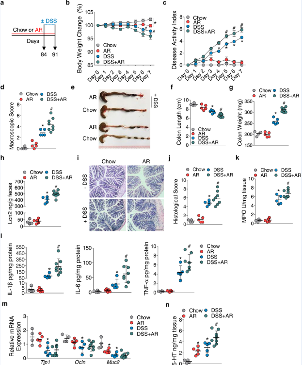 食品中的化學物質(zhì)被廣泛使用,從而導致了人類大量的暴露,誘惑紅(AR,Allura Red AC)就是一種非常常見的合成著色劑(synthetic colorant),然而,研究人員并不清楚其對結(jié)腸炎的影響效應。近日,一篇發(fā)表在國際雜志Nature Communications上題為“Chronic exposure to synthetic food colorant Allura Red AC promotes susceptibility to experimental colitis via intestinal serotonin in mice”的研究報告中,來自麥克馬斯特大學等機構的科學家們通過研究發(fā)現(xiàn),長期攝入誘惑紅食物染料或會潛在誘發(fā)機體炎性腸病的發(fā)生,文章中,研究人員利用炎性腸病實驗性動物模型進行研究后發(fā)現(xiàn),持續(xù)暴露于誘惑紅或會損傷機體腸道健康并促進機體炎癥發(fā)生。