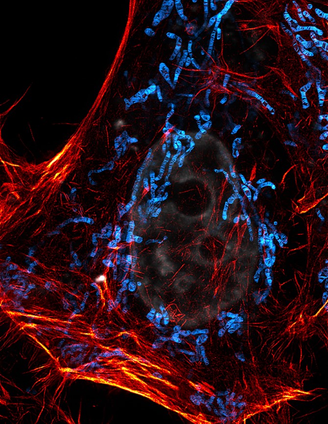 圖1:PKMO標(biāo)記的HeLa細(xì)胞線粒體內(nèi)嵴、微絲蛋白(SPY650FastAct)和細(xì)胞核(SPY505 DNA)的多色活細(xì)胞成像圖