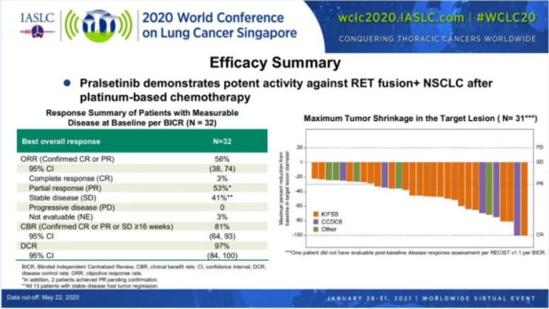 2020年WCLC大會上ARROW研究中國數據公布,來自10個中國研究中心的37例晚期RET融合陽性非小細胞肺癌患者納入了全球ARROW研究。結果顯示:32例基線有可評估病灶的患者中,確認的客觀緩解率 (ORR) 為56% (95% CI: 38-74%), 包括1例完全緩解和17例部分緩解(PR),除此之外,還有2例部分緩解待確認。疾病控制率為97%,其中1例不可評估。