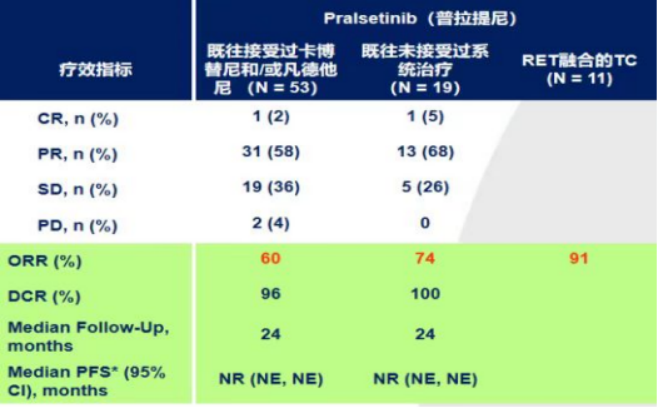 ARROW研究結果顯示為:在先前接受過卡博替尼和/或凡德他尼治療的55例RET突變轉移性MTC患者中,普拉替尼治療的總緩解率(ORR)為60%。在沒有接受過卡博替尼和/或凡德他尼治療、被確認為不適合標準護理的29例RET突變晚期MTC患者中,ORR為74%。在11例RET融合陽性轉移性甲狀腺癌患者中,ORR為91%。