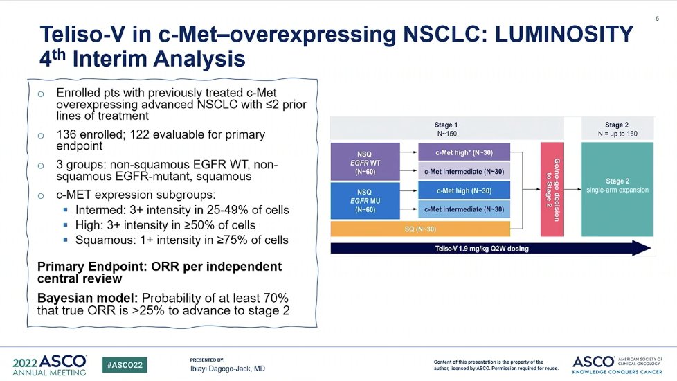 在該研究中分配接受每 21 天 2.7 mg/kg Met 靶向抗體-藥物偶聯(lián)物 teliso-v 加厄洛替尼 150 mg/天的 42 名成人中,36 名患有可評(píng)估的疾病; 28 例 c-Met 過表達(dá)、MET 外顯子 14 跳躍突變或 MET 擴(kuò)增以及 EGFR 突變呈陽(yáng)性。 5 例僅 C-Met 過表達(dá)呈陽(yáng)性,3 例 NSCLC 的 c-Met 過表達(dá)和罕見或未知的 EGFR 突變均呈陽(yáng)性。