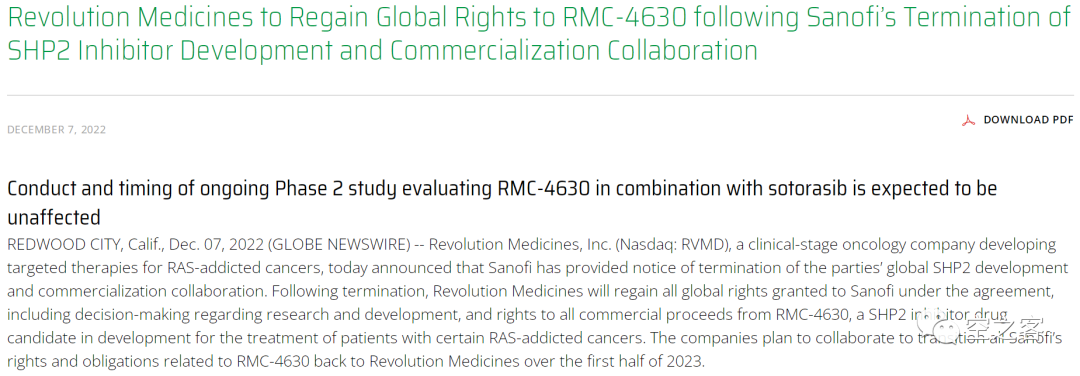 12月7日,Revolution Medicines宣布,Sanofi已終止在SHP2抑制劑RMC-4630上的合作,這個曾經(jīng)在臨床前階段就達到$50m upfront + >$500m milestone的地標性交易就此終結(jié)。